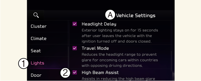 Con el botón ENGINE START/STOP (inicio/parada del motor) en la posición ON (activado), seleccione 'Lights (Luces) → High Beam Assist (Asistencia luces largas)' en el menú Ajustes del vehículo para activar la función de asistencia de luces largas y cancele la selección para desactivar la función.