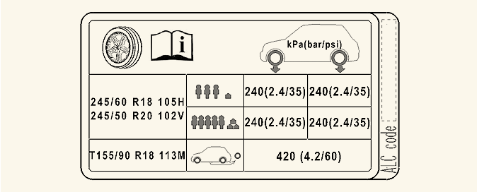 La etiqueta situada en el umbral de la puerta del conductor indica el tamaño original de los neumáticos, las presiones de los neumáticos en frío recomendadas para su vehículo, el número de personas que pueden estar en su vehículo y la capacidad de peso del vehículo.