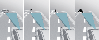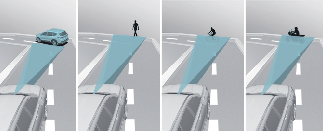 La ilustración anterior muestra la imagen que la cámara de visión delantera y el radar frontal son capaces de detectar como vehículo, vehículo de dos ruedas con motor, peatón y ciclista.