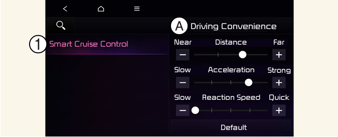 Con el vehículo encendido, toque Ajustes → Vehículo → Asistencia al conductor → Comodidad del conductor → Control de crucero inteligente en el sistema de infoentretenimiento para ajustar la distancia, aceleración y la velocidad de reacción.