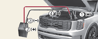 Conecte un extremo del cable de puente al terminal negativo de la batería de refuerzo (3) y conecte el otro extremo a un punto sólido, estable y metálico alejado de la batería (4).