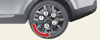 Después de cambiar las ruedas, haga apretar las tuercas de las ruedas al par de apriete correcto lo antes posible en un distribuidor Kia autorizado. La tuerca de la rueda debe apretarse a 11~13 kgf·m (79~94 lbf·pies).