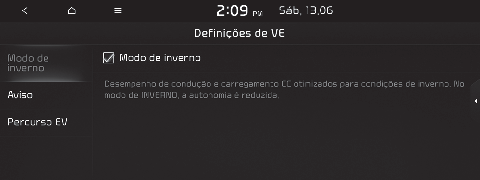 O modo de inverno é eficiente durante o inverno, quando a temperatura da bateria de alta tensão é baixa. Este modo é recomendado para melhorar o desempenho de condução e de carregamento CC durante o inverno ao aumentar a temperatura da bateria para um nível adequado. No entanto, pode reduzir significativamente a distância a vazio, uma vez que a bateria de alta tensão consome muito mais eletricidade.