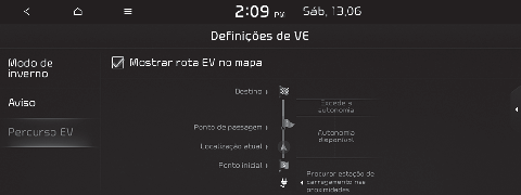 Pode definir as funções Winter Mode (Modo de inverno), Warning (Aviso) e EV route (Rota EV).
