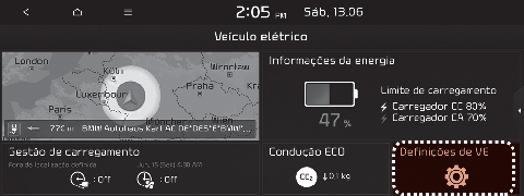 Pode aplicar funções elétricas do veículo para orientar a rota. Deste modo, poderá verificar a distância que pode percorrer com a quantidade atual de bateria. São apresentadas no ecrã as secções por onde pode e por onde não pode viajar no percurso para o seu destino. Também é apresentado o ícone de pesquisa de estações para que consiga encontrar estações próximas de imediato.
