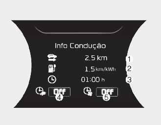 No final de cada ciclo de condução, é exibida a mensagem de Informações de condução. Este visor apresenta a distância quilométrica (1), o consumo médio de energia (2), o tempo de condução (3), o estado do tempo de carregamento (4) e o estado do tempo de climatização (5).