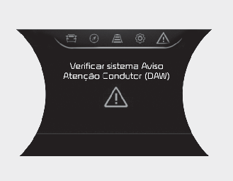 Quando a mensagem de aviso “Verificar o Aviso de atenção do condutor (DAW)” é apresentada, a função não está a funcionar corretamente. Neste caso, mande verificar a função numa oficina profissional. A Kia recomenda que visite um concessionário/parceiro de serviços autorizado Kia.