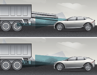 Ako vozilo ispred vas ima teret koji viri prema natrag iz kabine ili kada vozilo ispred vas ima veći razmak od tla, potrebna je dodatna posebna pažnja. Pomoćnik za izbjegavanje sudara prema naprijed možda neće moći otkriti teret koji viri iz vozila. U tim slučajevima, potrebno je održavati siguran put kočenja od najisturenojeg predmeta i ako je potrebno, upravljati vozilom i pritisnuti papučicu kočnice kako bi se smanjila brzinu vožnje u cilju održanja udaljenosti.