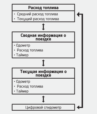 На дисплее отображается пройденное расстояние, средняя эффективность использования топлива и общее время в пути один раз в течение каждого цикла включения зажигания.