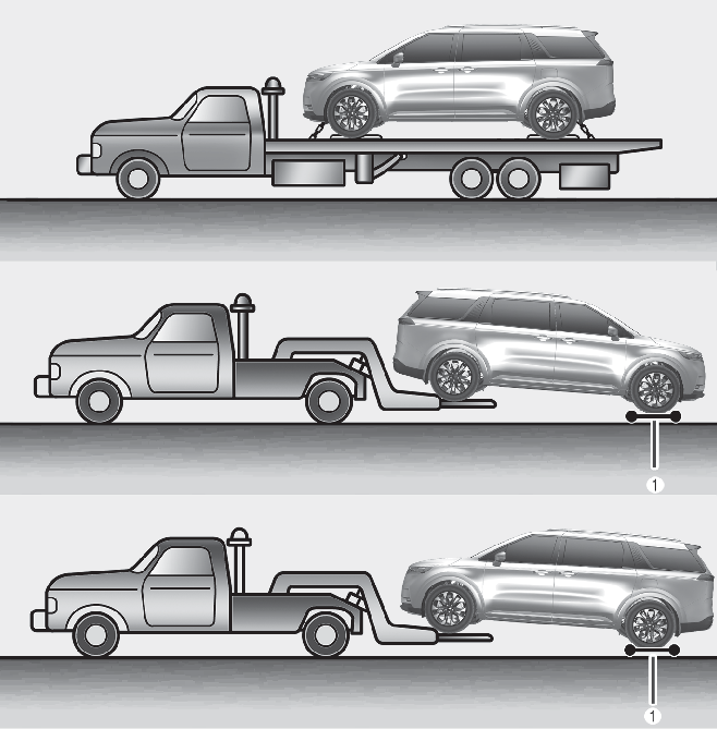 Если необходимо отбуксировать автомобиль, рекомендуется обратиться к официальному дилеру компании Kia или в эвакуаторную службу. Для предотвращения повреждения автомобиля необходимо соблюдать правильные процедуры погрузки и буксировки. Рекомендуется использовать колесные тележки (1) или безбортовую платформу.