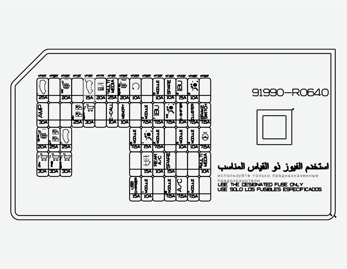 На внутренней стороне крышки панели предохранителей/реле находится табличка с указанием наименования и номинальных параметров предохранителей/реле.