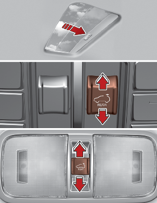 Empurre o interruptor do vidro do teto de abrir para a frente ou para trás até à primeira posição de retenção; o teto de abrir deslocar-se-á até libertar o interruptor.