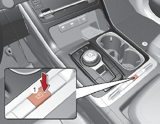 Com ecrã do sistema de infotainment apresentado, prima brevemente o botão Parking/View (Estacionamento/visualização) (1) quando a mudança está na posição D (Condução) ou N (Ponto-morto) e a velocidade do veículo é inferior a 10 km/h (6 mph).