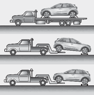 Laat de auto bij voorkeur wegslepen door een officiële Kia-dealer of een erkend bergingsbedrijf. Om schade aan uw auto te voorkomen, moeten de juiste procedures voor slepen worden gevolgd. Wij bevelen het gebruik van dollies (1) of een autoambulance aan.