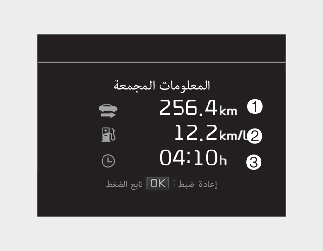 تعرض هذه الشاشة مسافة الرحلة المتراكمة (1) ومتوسط كفاية الوقود (2) ووقت القيادة الكلي (3).