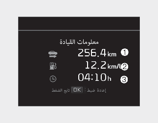 تعرض هذه الشاشة مسافة الرحلة (1) ومتوسط توفير الوقود (2) ووقت القيادة (3).