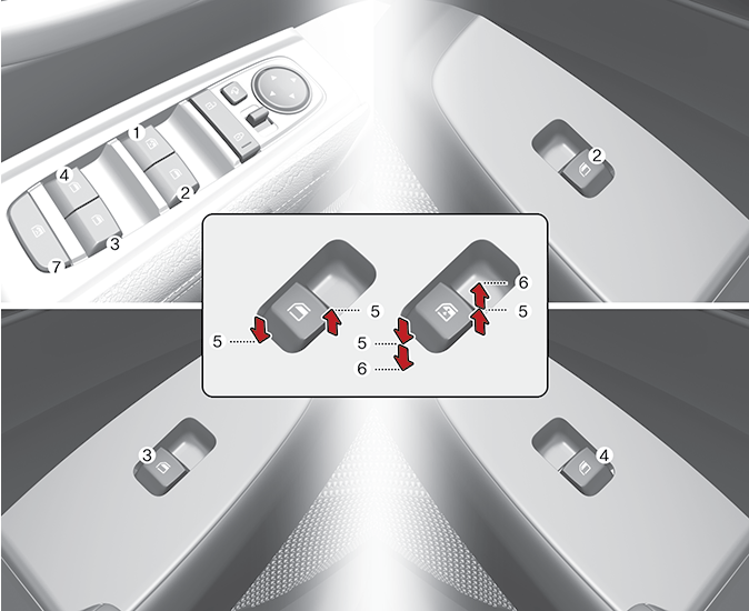 يتوفر لباب السائق مفتاح رئيسي لتشغيل النوافذ الكهربائية والذي يتحكم في جميع نوافذ السيارة.