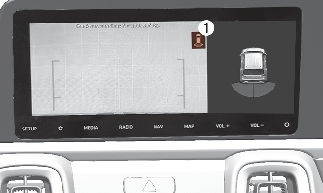 عند لمس الرمز (1)، يتم عرض المظهر العلوي على الشاشة وتظهر المسافة من سيارتك إلى جزئها الخلفي. المس الأيقونة (1) مرة أخرى، للعودة إلى الشاشة السابقة.