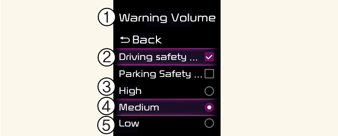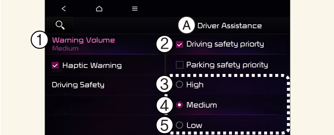 Si vous changez le volume de l'avertissement, celui des autres systèmes d'assistance à la conduite peut changer.