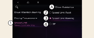 La fonction de limite de vitesse et d'avertissement e vitesse fonctionne sur la base du réglage de décalage ajouté à la limite de vitesse. Régler la valeur de décalage sur '0' pour modifier ou prévenir de la vitesse en fonction de la limitation de vitesse reconnue.