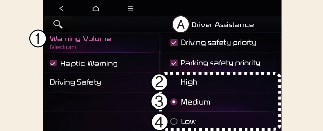 Lorsque le véhicule est activé, effleurez Réglages → Assistance au conducteur → Volume sonore de l'avertissement sur le combiné d'instruments ou Réglages → Véhicule → Assistance au conducteur →Volume sonore de l'avertissement sur le système d'info-divertissement afin de modifier le volume de l'avertissement pour régler les niveaux de volume de l'avertissement ; Haut, Moyen, Bas ou Désactivé.
