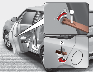 When opening the doors, always be careful and watch out for vehicles, motorcycles, bicycles or pedestrians approaching the vehicle. Opening a door when something is approaching can result in an accident to cause vehicle damage or serious injury.