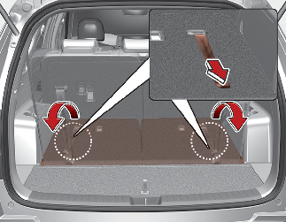 Pull on the seatback folding lever (for 2nd row) or strap (for 3rd row), then fold the seat toward the front of the vehicle. When you return the seatback to its upright position, always be sure it has locked into position by pushing on the top of the seatback.