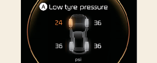 Когато предупредителните индикатори на системата за следене на налягането в гумите са включени и на дисплея на арматурното табло се появи предупредително съобщение, една или повече гуми са недостатъчно напомпани. Индикаторът за позиция на гума с ниско налягане показва коя е спадналата гума, като включва съответния индикатор за позиция на гумата.