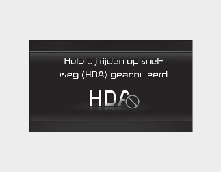 Indien de handen van de bestuurder nog steeds niet op het stuur zijn na de waarschuwing, verschijnt de waarschuwingsmelding 'Highway Driving Assist (HDA) geannuleerd' en wordt het Highway Driving-systeem automatisch geannuleerd.