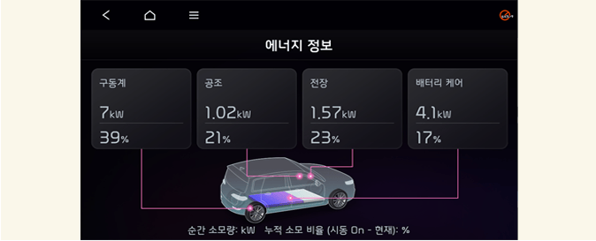 클러스터, 인포테인먼트 시스템(스피커, 내비게이션), 전조등, 차량 제어기 등의 차량 시스템이 사용하는 파워 및 에너지 소모 비율을 표시합니다.