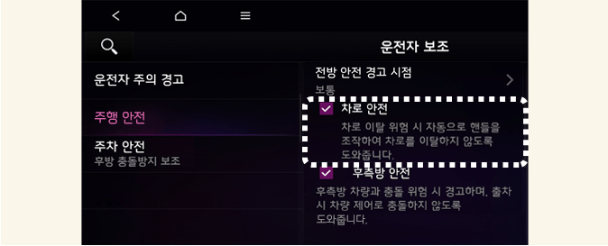 차로 안전: 차로 안전을 선택하면 차로 이탈이 감지될 경우 차로를 이탈하지 않도록 조향을 도와줍니다.