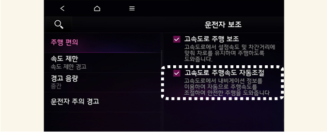 내비게이션의 진출입로 정보를 이용하여 주행속도가 높을 경우 일시적으로 감속하여 안전한 속도로 주행하도록 도와줍니다.