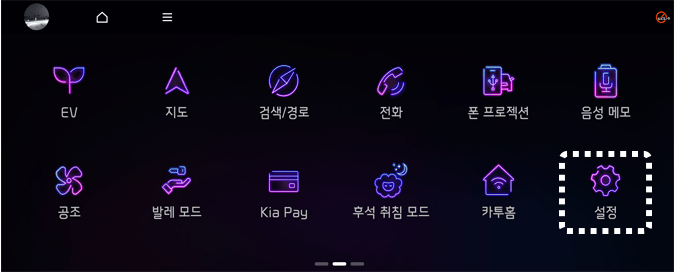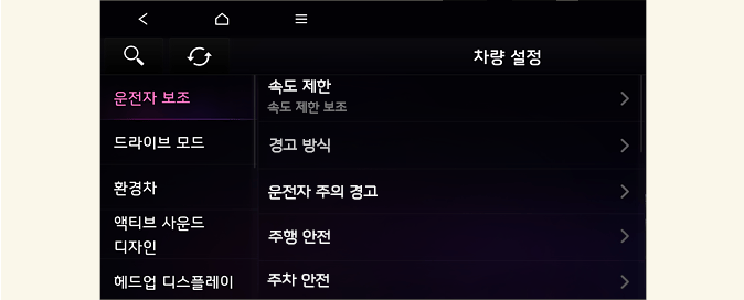 차량에서 표시할 항목이나 안내할 항목을 설정할 수 있습니다. 인포테인먼트 시스템 화면 내에 차량 설정 메뉴를 선택한 후에 해당 항목들을 설정하십시오.