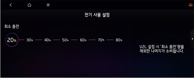 현재의 고전압 배터리 충전량이 설정한 방전 제한량(%)에 도달하면 작동이 중지되며 경고문이 표시됩니다. V2L 작동을 원하는 경우 방전 제한량을 현재 배터리 충전량(%)보다 낮추어 설정하십시오.