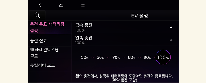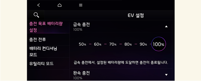 급속 충전이나 완속 충전할 때, 배터리 목표 충전량을 설정하여 운전자가 원하는 최종 충전량을 선택할 수 있습니다.