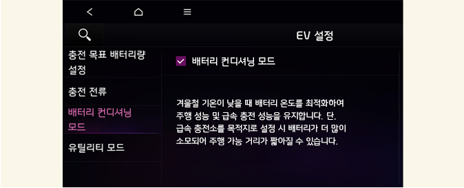 배터리 컨디셔닝 모드는 구동용(고전압) 배터리의 온도가 낮아 성능이 떨어지는 겨울철에 유용한 기능입니다. 겨울철 주행 성능과 급속 충전 성능 유지를 위해 본 기능의 사용을 권장합니다. 단, 배터리의 온도를 높이기 위해서 에너지를 소모하기 때문에 주행 가능 거리가 짧아질 수 있습니다.