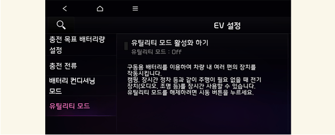 인포테인먼트 시스템의 'EV 설정 → 유틸리티 모드' 화면에서 유틸리티 모드 활성화하기 메뉴를 선택하십시오.