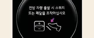 정차 후 약 30초가 지나면 클러스터에 위 그림과 같이 안내문이 표시됩니다. 다시 출발하려면 가속 페달을 밟거나, 「+」 또는 「-」 스위치를 올리거나 또는 내리거나, 「