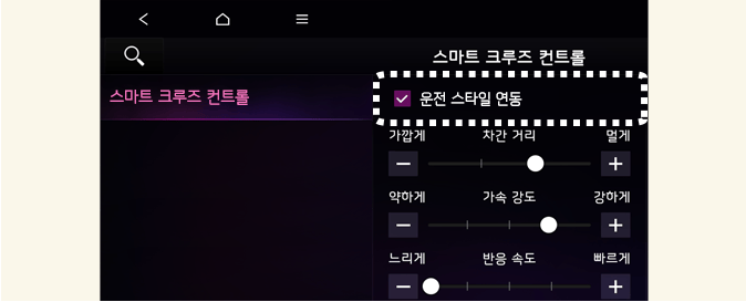 운전 스타일 연동을 지원하는 경우에만 인포테인먼트 시스템의 설정 → 차량 → 운전자 보조 → 주행 편의 → 스마트 크루즈 컨트롤 메뉴에서 운전 스타일 연동을 선택할 수 있습니다.