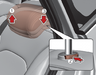 لرفع مسند الرأس، اسحبه لأعلى للوضع المطلوب (1). لخفض مسند الرأس، ادفع مع الاستمرار زر التحرير (2) بدعامة مسند الرأس، ثم اخفض مسند الرأس للوضع المطلوب (3).