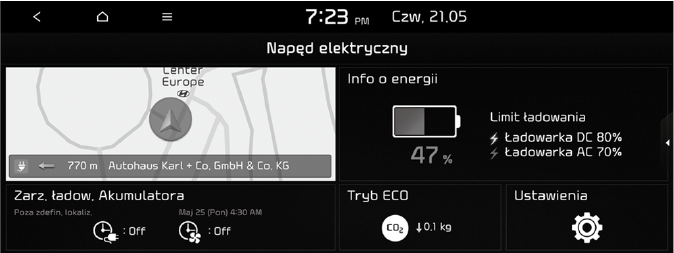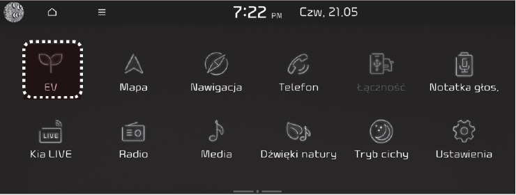 * Zdjęcie ekranu menu EV ukazane w niniejszej instrukcji może różnić się od rzeczywistego ekranu w zależności od specyfikacji pojazdu i wersji oprogramowania systemu multimedialnego. Dodatkowe informacje podano w „PODRĘCZNIKU SYSTEMU MULTIMEDIALNEGO SAMOCHODU”.