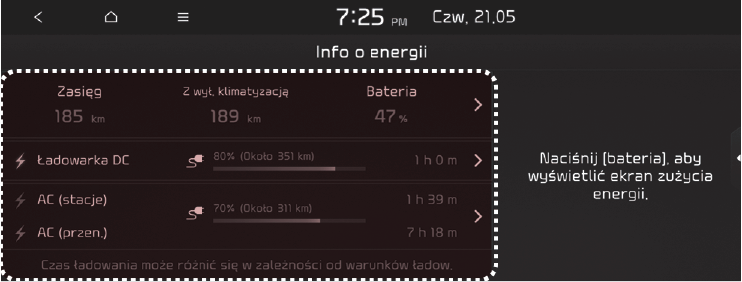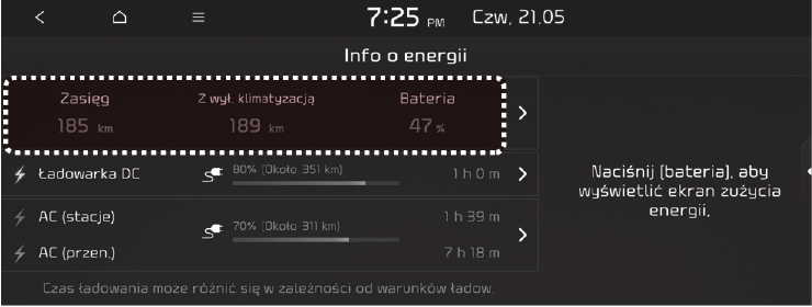 Wybrać „EV → Energy information (Informacje o energii) → Driving range, battery (Zasięg, akumulator)” na ekranie.