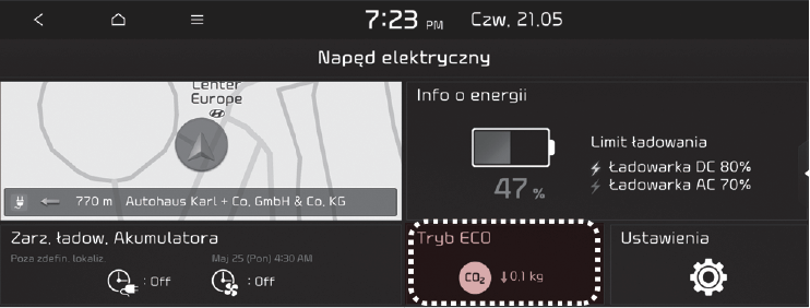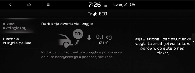 Wyświetlane są informacje dotyczące ograniczenia emisji CO2 w porównaniu z pojazdami napędzanymi paliwem.