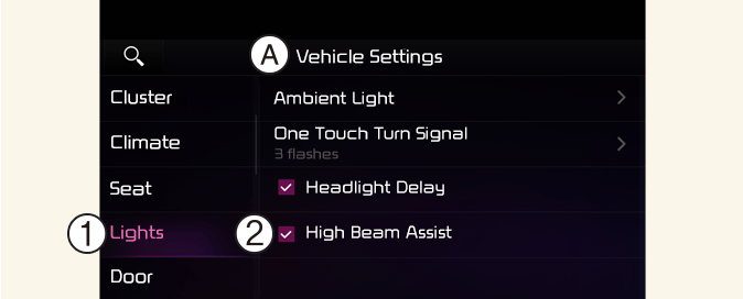 Kui sõiduk töötab, valige seadete menüüs kaugtulede abisüsteemi funktsiooni sisselülitamiseks Lights (Tuled) → HBA (Kaugtulede abisüsteem).
