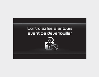 Lorsque le verrouillage électronique de la sécurité enfant fonctionne et qu'un véhicule approchant par l’arrière est détecté, les portières arrière ne peuvent pas être déverrouillées même si le conducteur essaie de les déverrouiller à l'aide du bouton de verrouillage électronique de la sécurité enfant. Le message d’avertissement ‘Check surroundings then try again (Vérifiez les alentours, puis réessayez)’ s’affichera sur le combiné d’instruments.