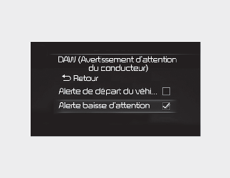 Si « Avertissement de conduite inattentive » est sélectionné, la fonction informe le conducteur de son niveau d’attention et lui recommande de faire une pause lorsque ce niveau tombera en dessous d’un certain seuil.