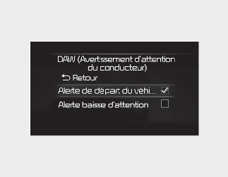 Lorsque le bouton de démarrage/d'arrêt du moteur est en position ON, (dé)sélectionnez 'Driver Assistance (Assistance au conducteur) → Driver Attention Warning (Avertissement de l'attention du conducteur)' dans le menu Réglages pour déterminer s'il faut ou non utiliser chaque fonction.