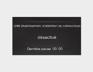 L’avertissement de détection de fatigue du conducteur ne suggérera pas de pause si le temps de conduite total est inférieur à 10 minutes ou que 10 minutes ne se sont pas écoulées depuis la dernière pause proposée.