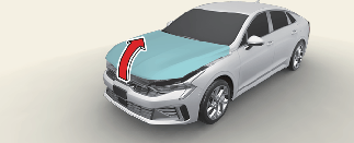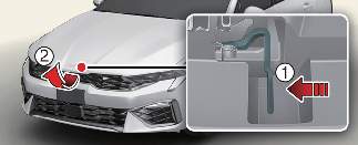 Go to the front of the vehicle, raise the hood slightly, push the secondary hood release lever (1) to the left and lift the