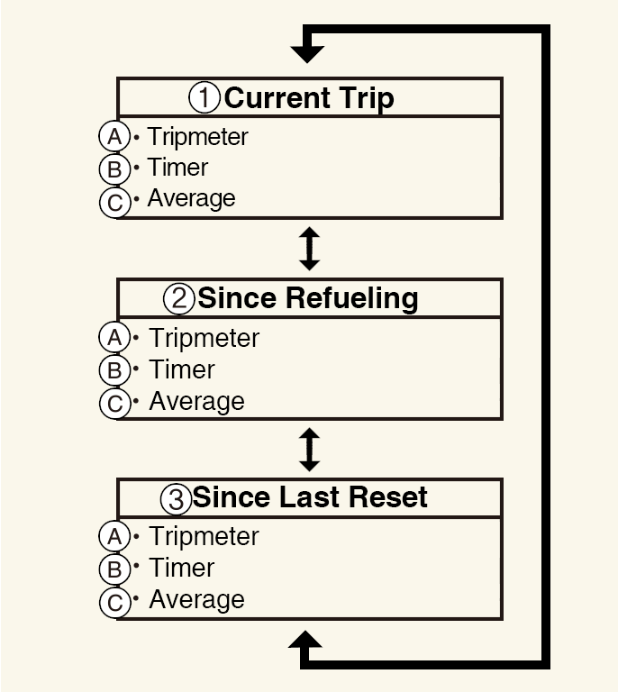 This display shows the trip distance (1), the total driving time (2), and the average fuel efficiency (3) information once per one ignition cycle.